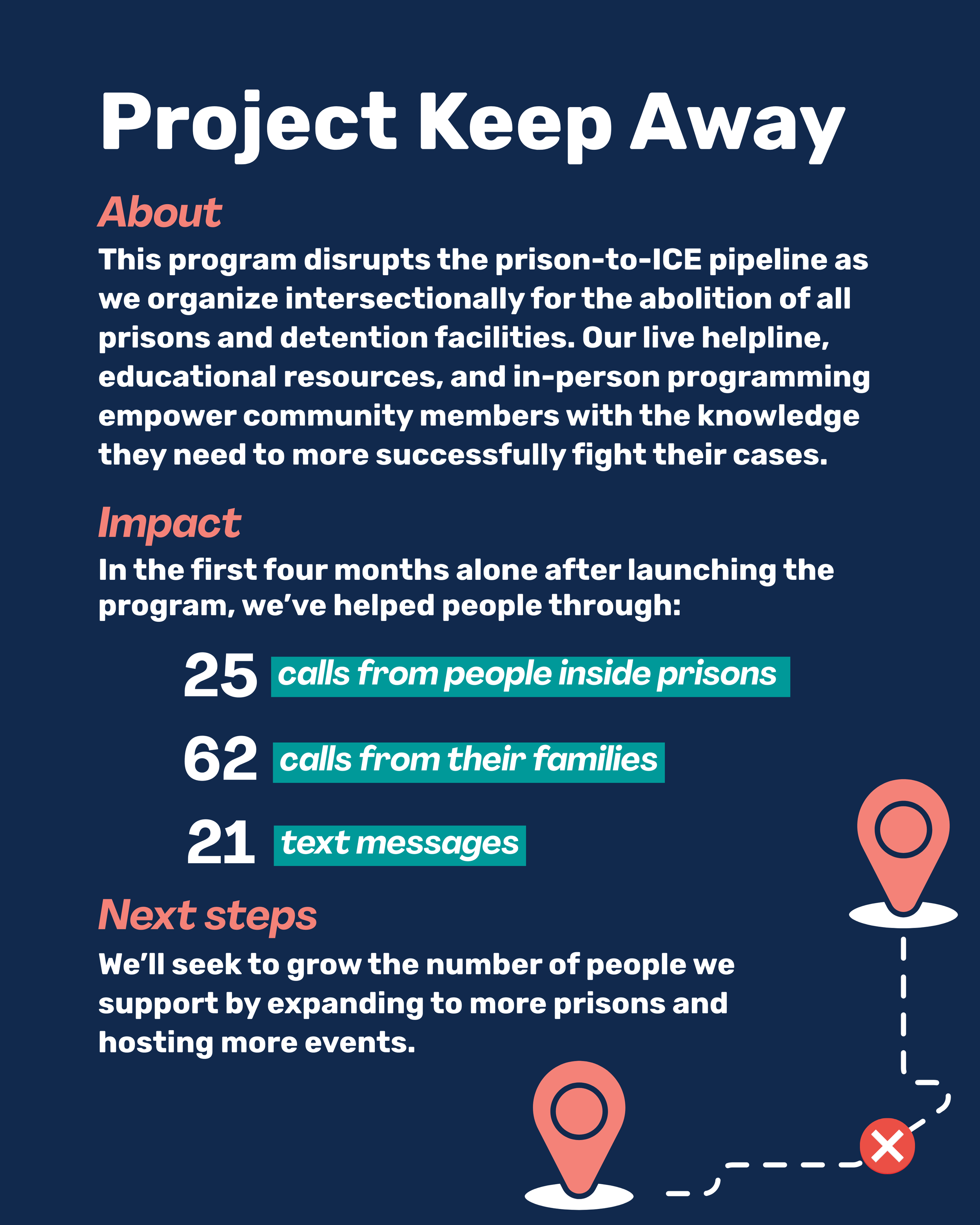 We’re addressing the criminalization of BIPOC people by expanding our Project Keep Away helpline and in-person programming to disrupt the prison-to-ICE pipeline.