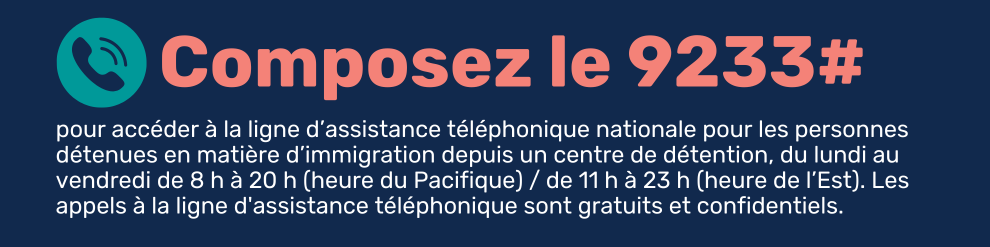 La ligne d'assistance téléphonique nationale de FFI pour les personnes détenues par l'ICE devrait être disponible dans tous les centres de détention. Si vous constatez que cette ligne est inaccessible dans un centre de détention, veuillez le signaler en soumettant un rapport ce formulaire si vous êtes en détention, vous pouvez nous écrire pour nous en informer :